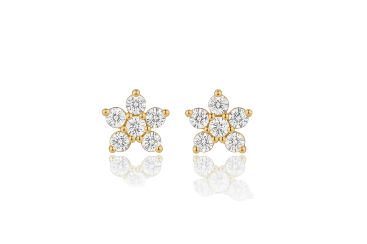 Paar goldener Blumenohrstecker, besetzt mit funkelnden weißen Steinen, mittig auf weißem Hintergrund platziert.