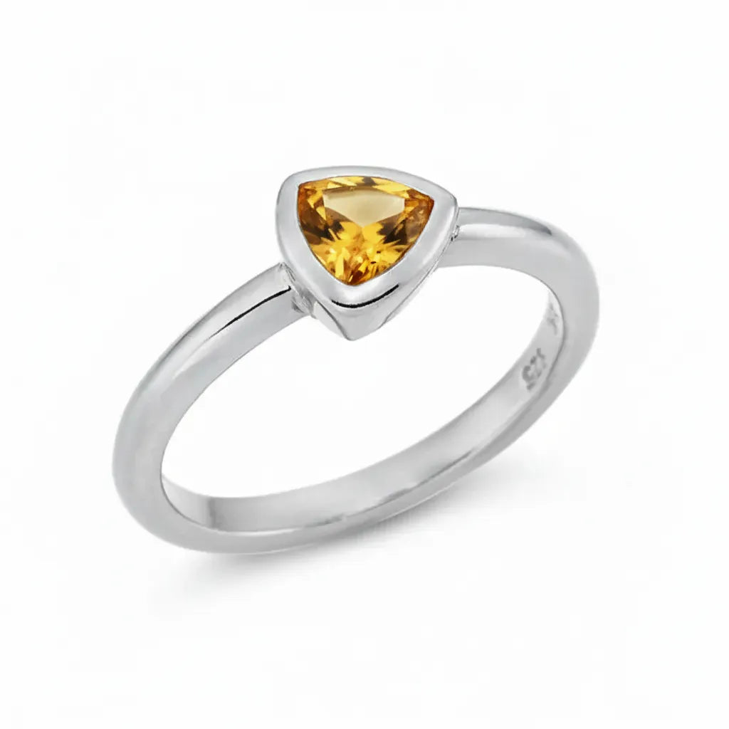 Nahaufnahme einer Frauenhand mit einem eleganten Silberring am Ringfinger. Der Ring besitzt einen dreieckigen, facettierten Citrinstein in warmem Goldgelb, der in einer glatten Zargenfassung sitzt. Das Licht spiegelt sich dezent auf der glänzenden Ringschiene, wodurch der klare, moderne Stil des Schmuckstücks betont wird. Der Fokus liegt deutlich auf dem Ring, während die Hand einen natürlichen Hautton aufweist und weich beleuchtet ist.